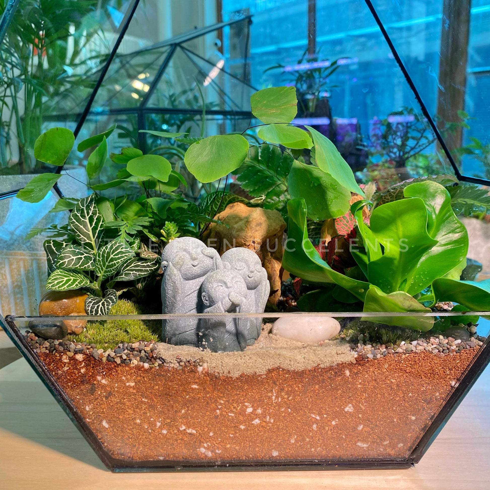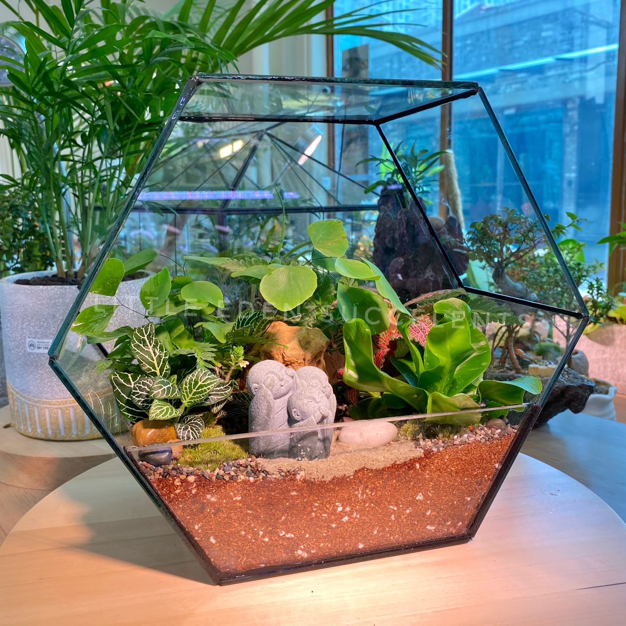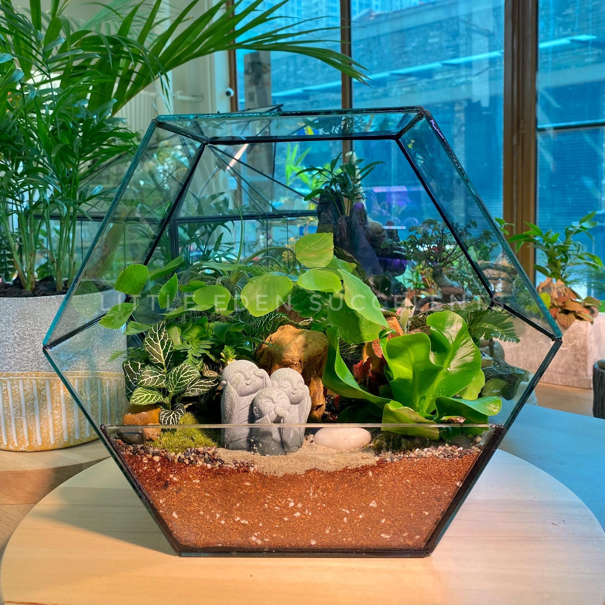 The plants are nestled securely, with the option to add small decorative items like stones or figurines. The hexagonal glass structure allows sunlight to filter in, making it an eye-catching centerpiece or accent for shelves and tables, bringing greenery and tranquility into any space.