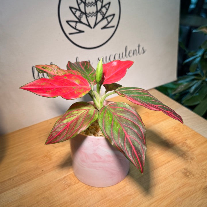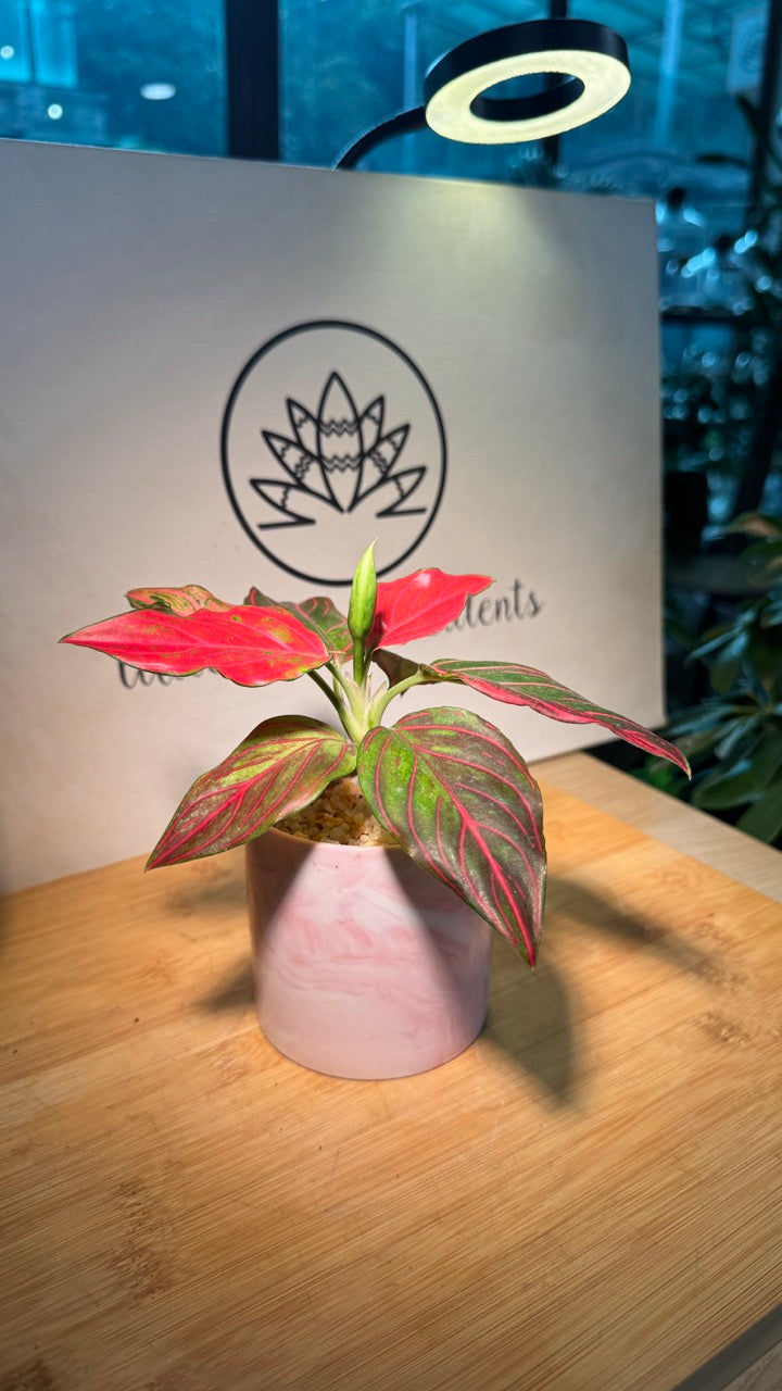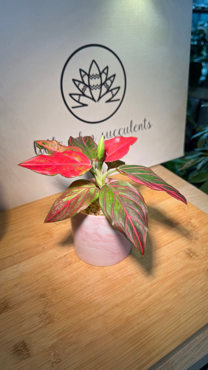 Brighten up your space with this stunning Aglaonema Red set in a pink marble ceramic pot. Featuring vivid red and green variegated leaves, this low-maintenance beauty adds a stylish, modern touch to any home or office.