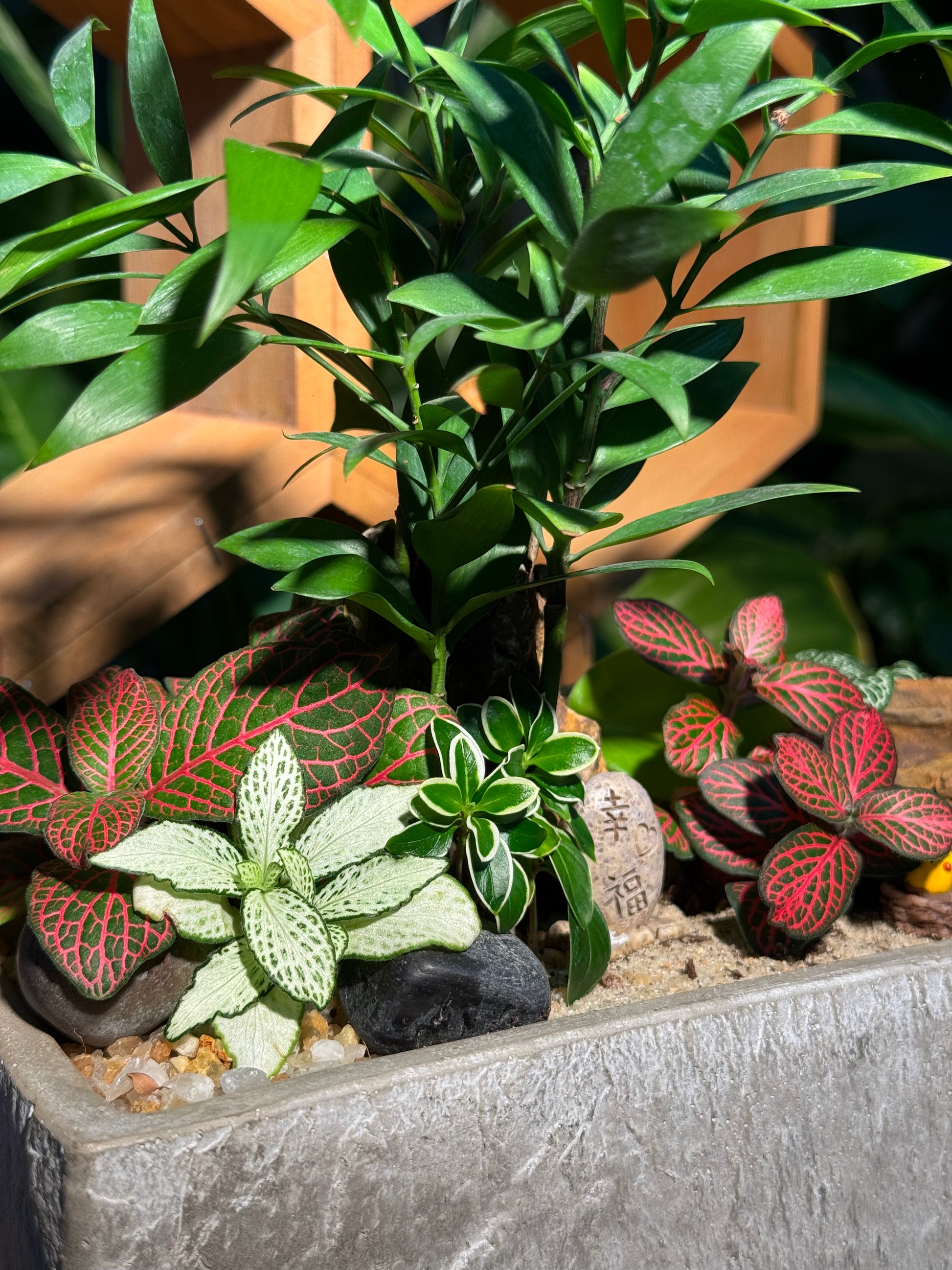 Fittonia and Podocarpus Arrangement in Zen Rectangle Concrete Pot