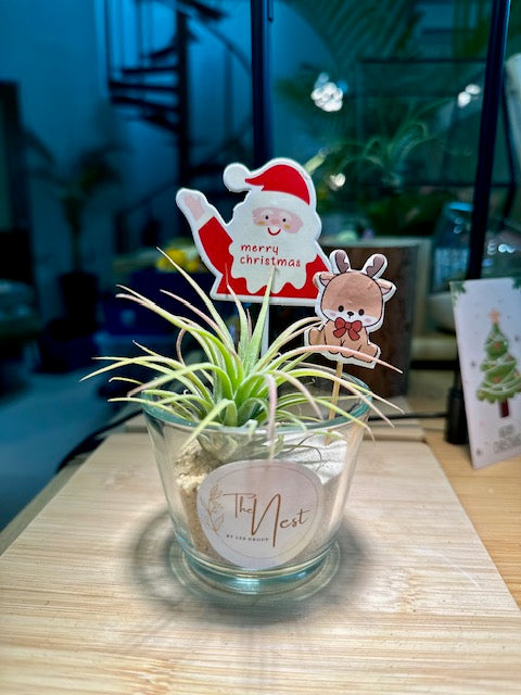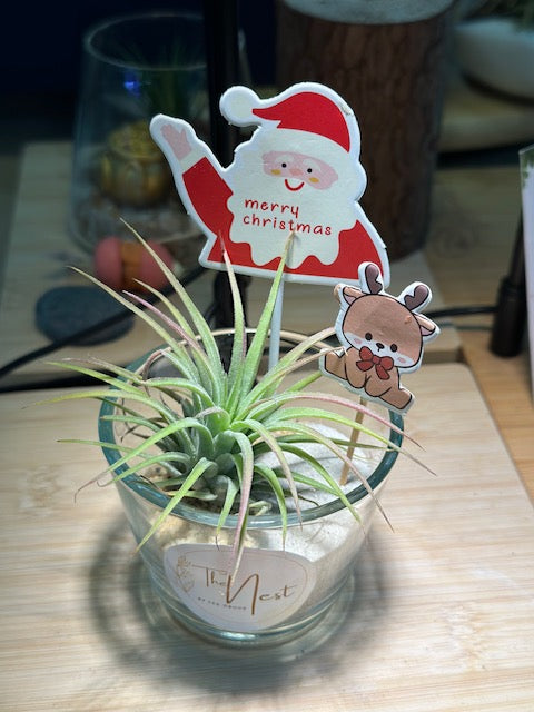 Bring the magic of Christmas to your space with our Christmas Charm Airplant in Glass Pot. This minimalist yet festive piece features a lush airplant nestled in a sleek glass pot, adorned with seasonal decorations like delicate baubles, pinecones, and a touch of sparkle.