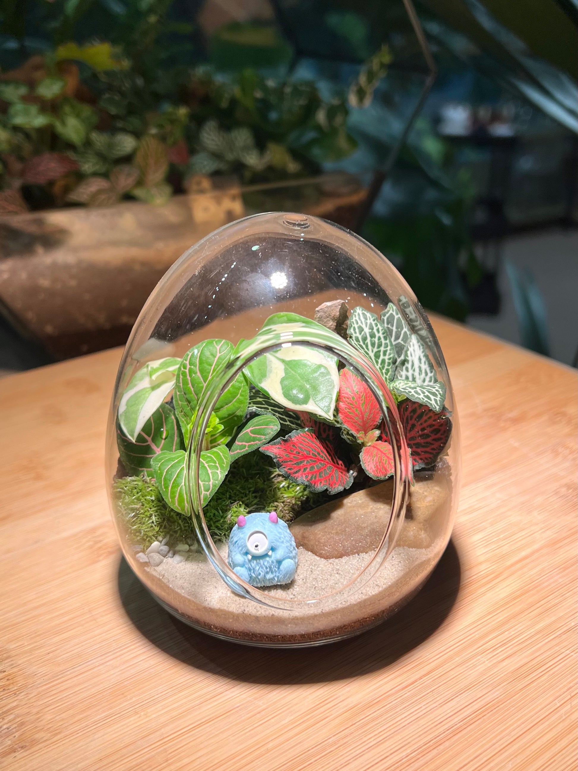 Housed in a small Eggette-shaped glass vessel, this arrangement showcases each leaf and layer with clarity, highlighting the interplay of patterns—Fittonia’s intricate network of veins alongside N’Joy’s crisp green-and-cream marbling. The moss adds warmth and grounding, completing the look with a forest-like touch.