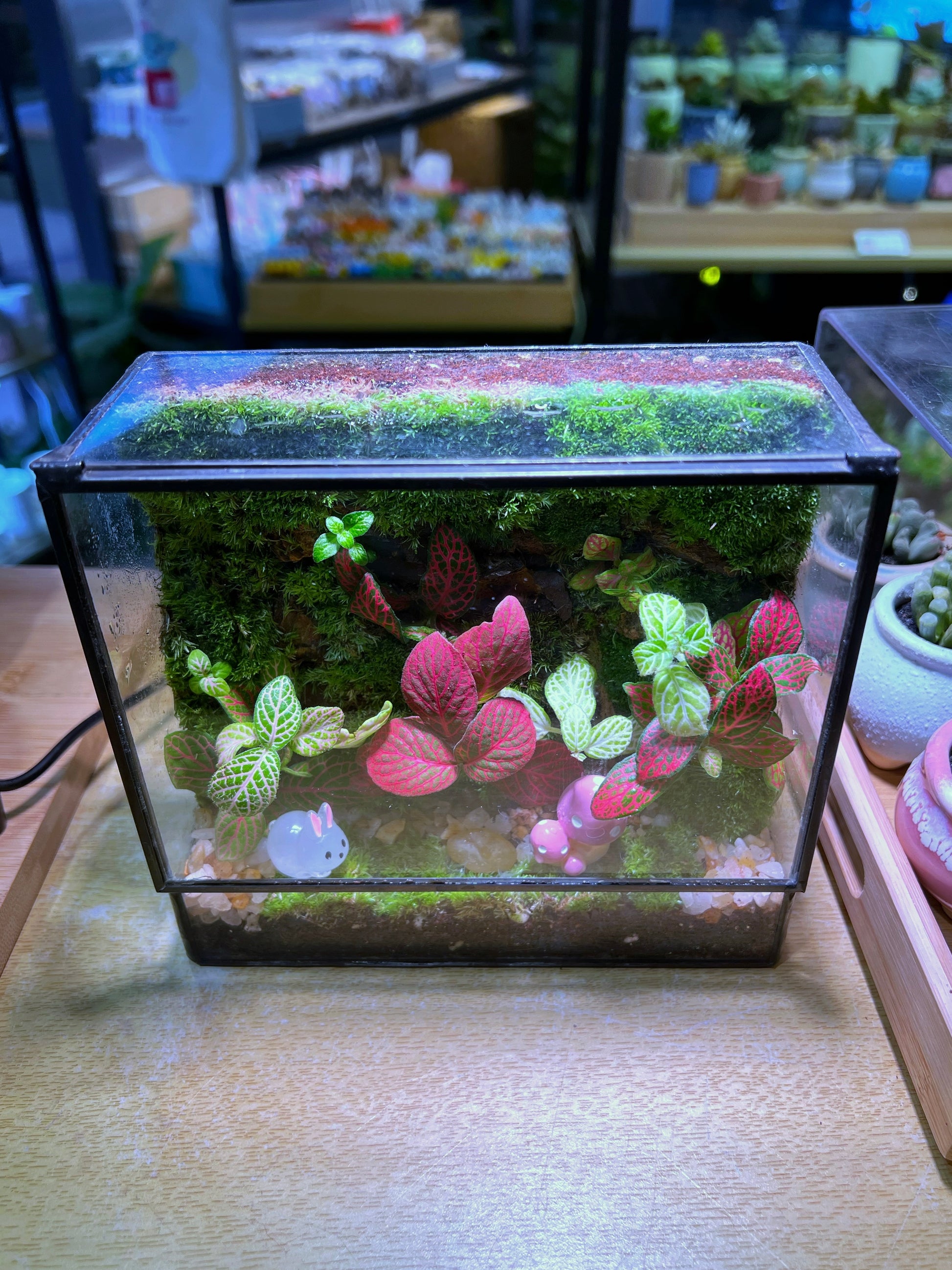 Moss Wall with Fittonia Arrangement in Black Rectangular Glass with Top Hung Lid (M)