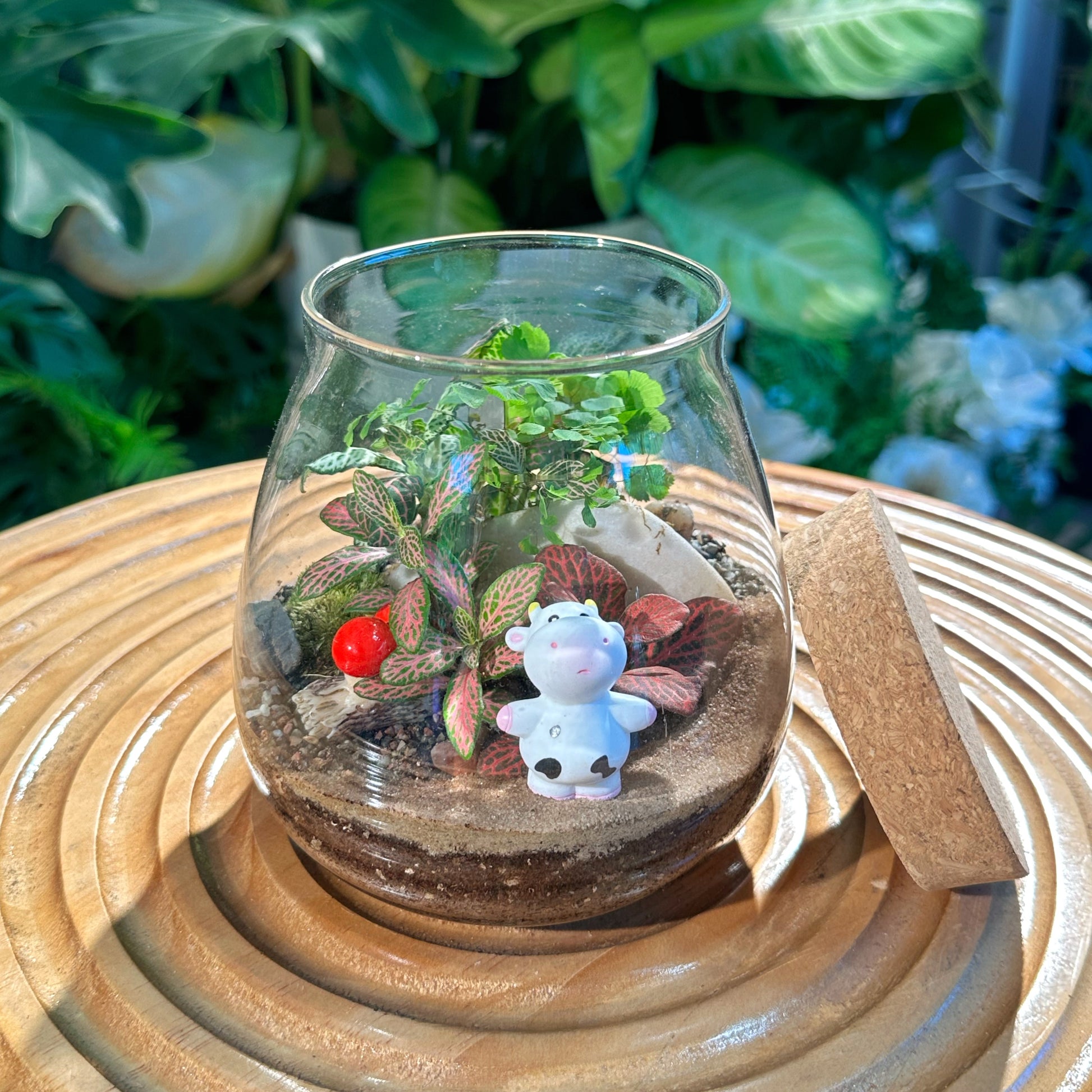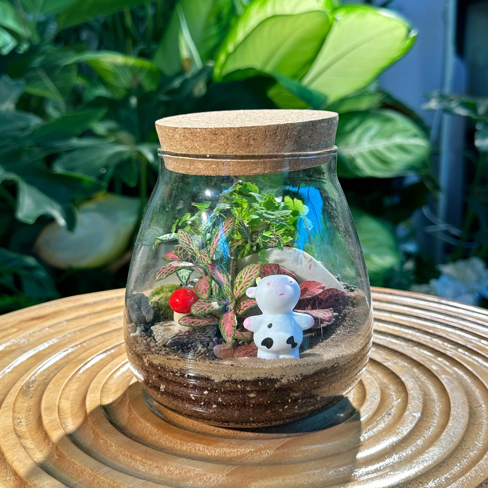"Experience the joy of nature's colors with our Fittonia in water drop glass, a delightful blend of botanical diversity and whimsical charm. Enclosed within a clear glass jar topped with a rustic cork lid, this terrarium bursts with vibrant hues of Fittonia, creating a cheerful and lively display. Each terrarium is meticulously curated to include a variety of Fittonia colors, enhancing the visual appeal and adding a playful touch to any space. Adorned with natural rocks and charming figurines, this terrarium invites you into a miniature world of enchantment and wonder. Fittonia thrives in the terrarium's micro-environment, requiring minimal care. Simply place in a bright spot with indirect sunlight and water as needed to maintain their vibrant foliage. Elevate your space with our Fittonia in Glass Jar Terrarium with Cork, available for purchase on our website. Let the beauty of nature brighten your home and bring a smile to your face."