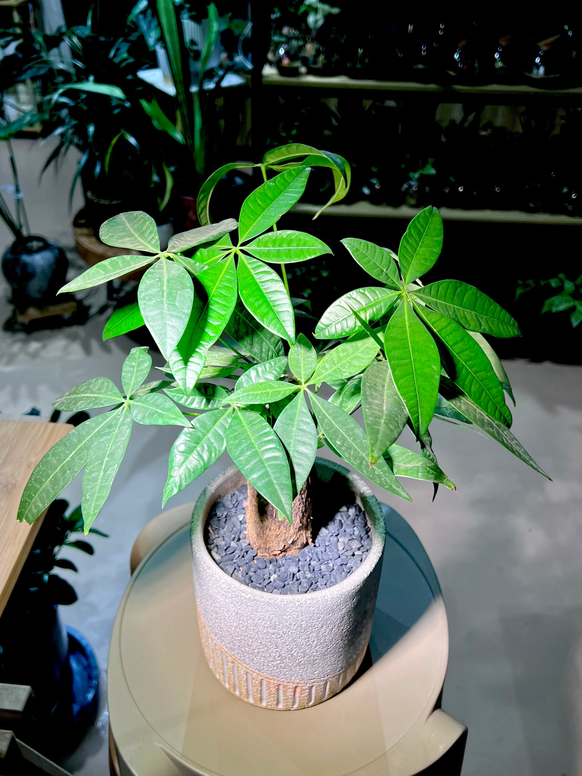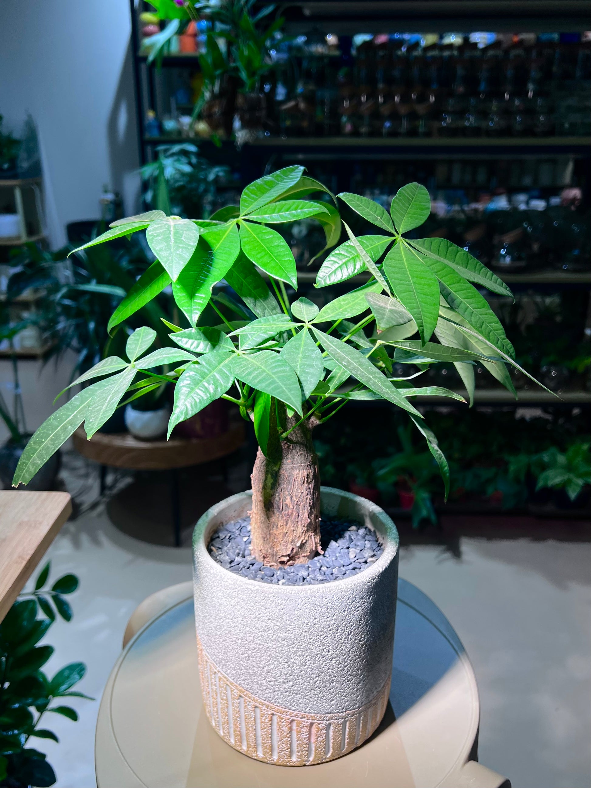 A striking Pachira (Money Tree) planted in a matte, textured ceramic pot with a stylish, modern design. Its glossy green leaves and braided trunk bring life and positive energy to any space, while the textured pot adds an elegant, contemporary touch. Ideal for living rooms, offices, or gifting, this arrangement combines low-maintenance greenery with chic home décor.