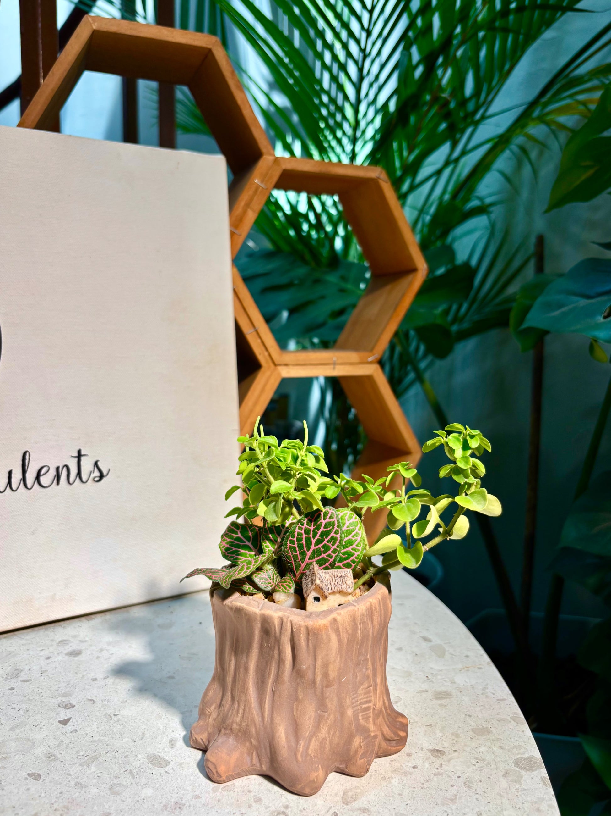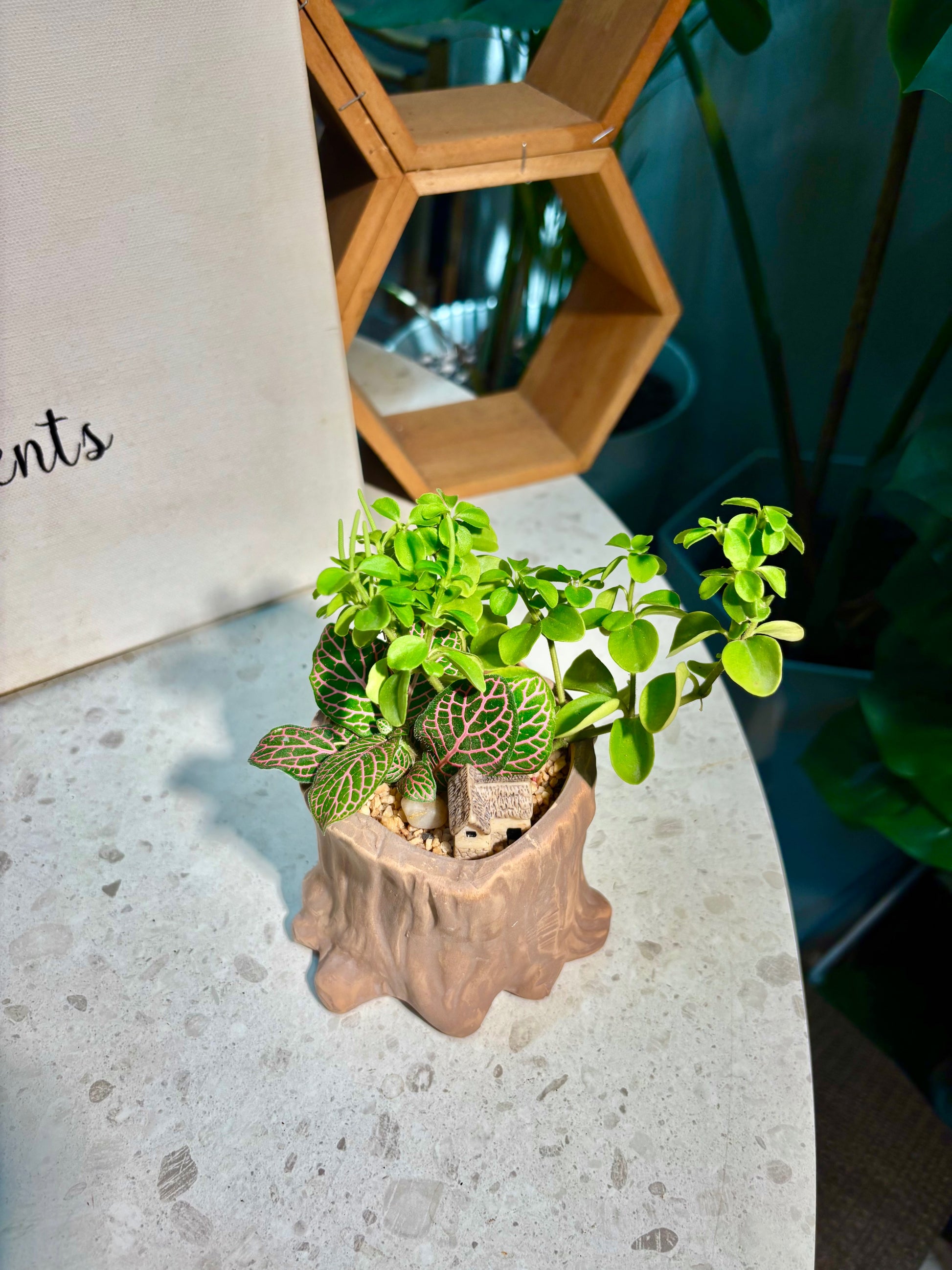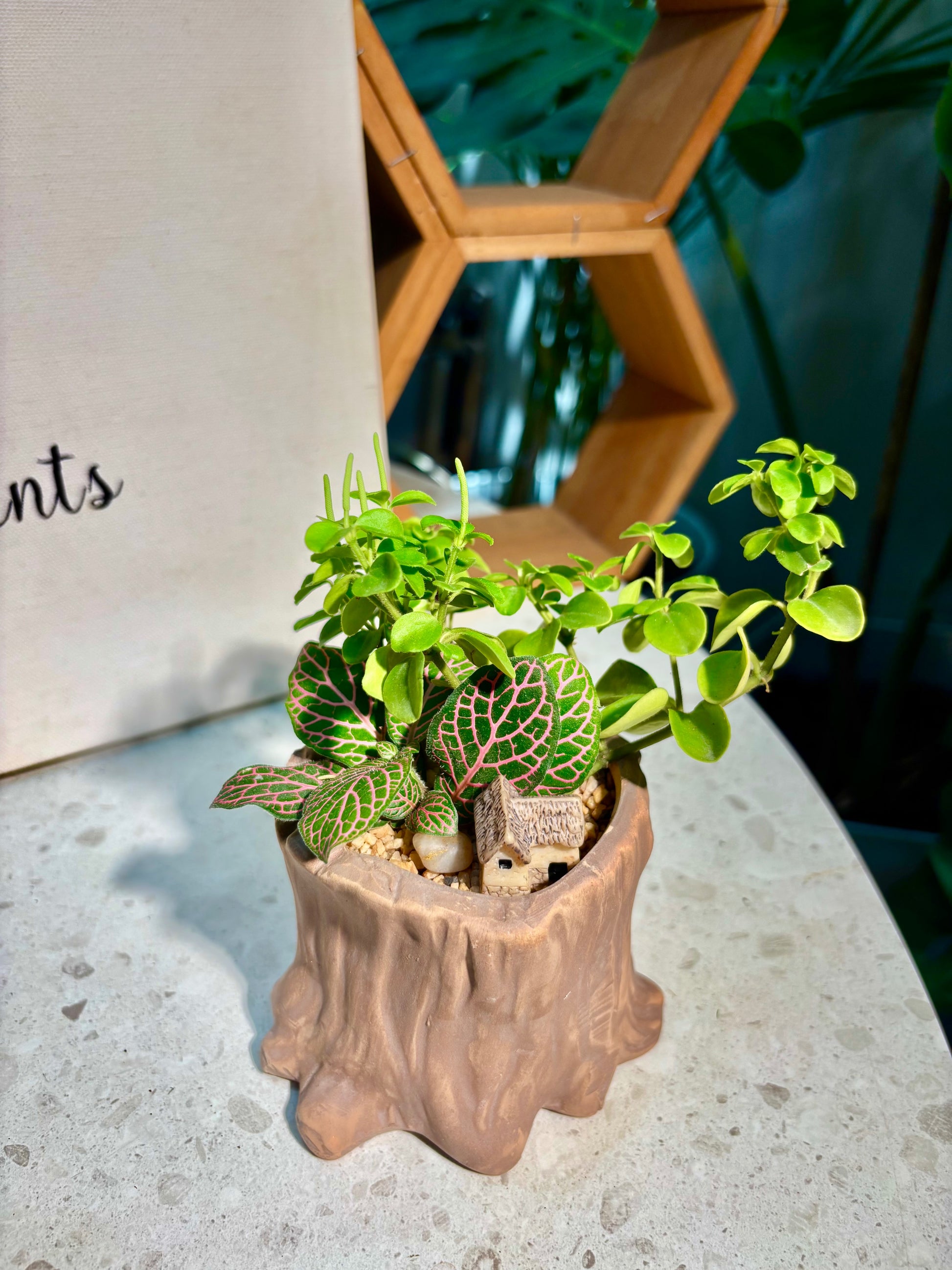 Fittonia & Peperomia Rotundifolia in Tree Trunk Pot 🪵