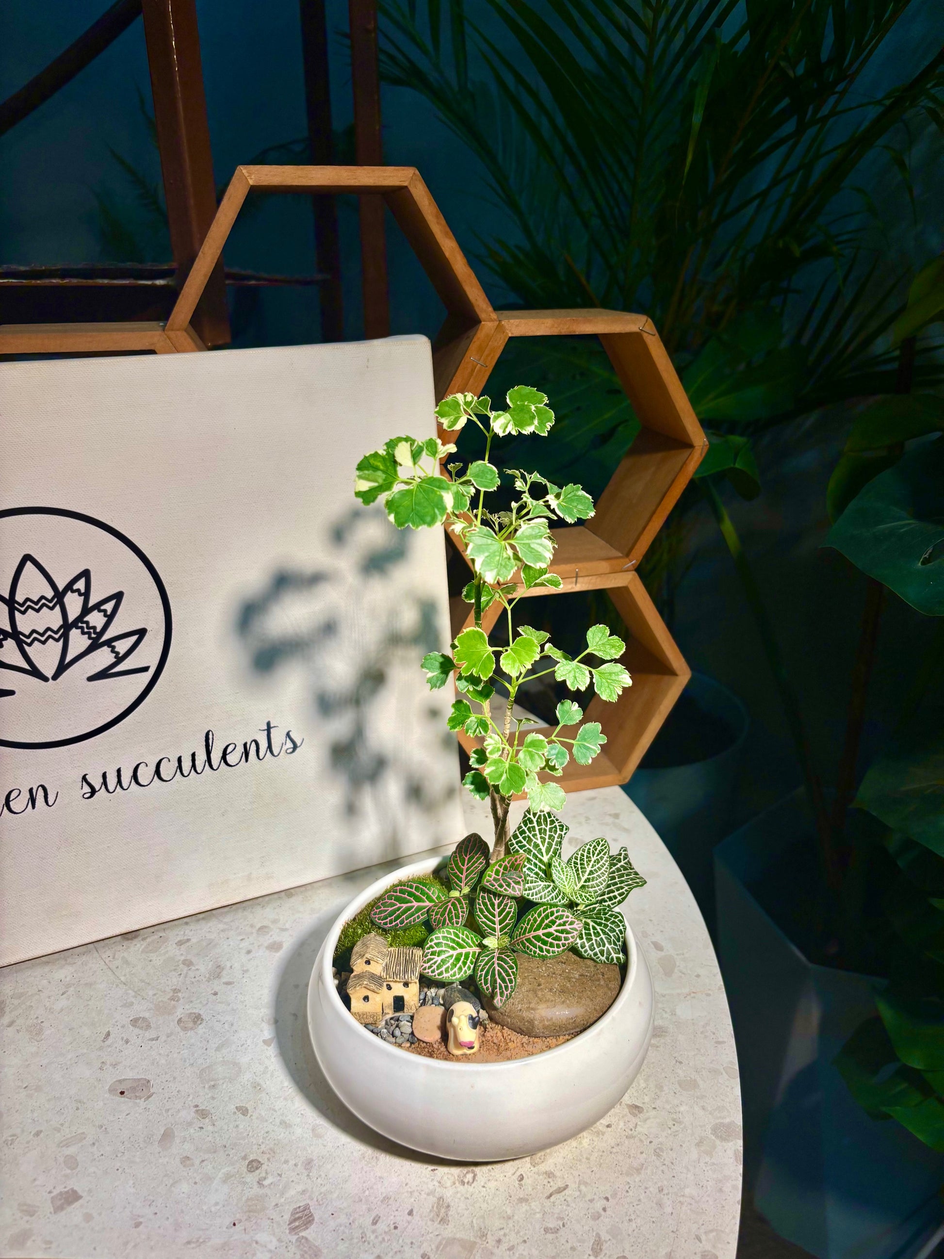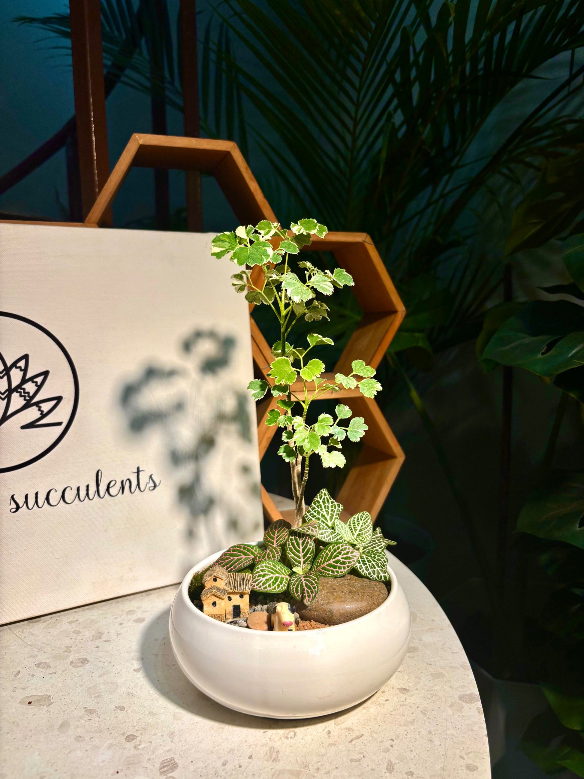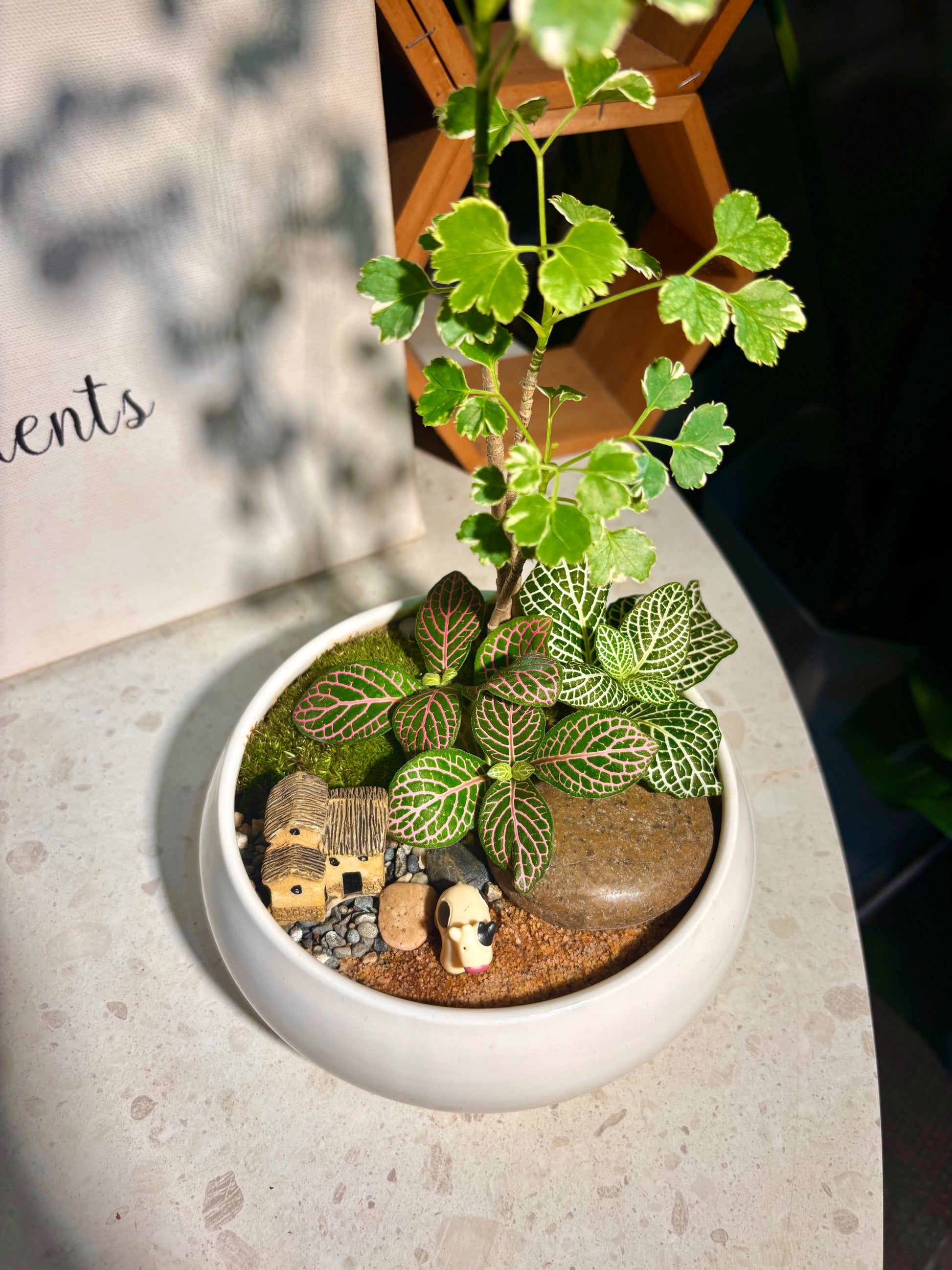 Fittonia & Polyscias Guifoylei Arrangement in White Pot 🤍