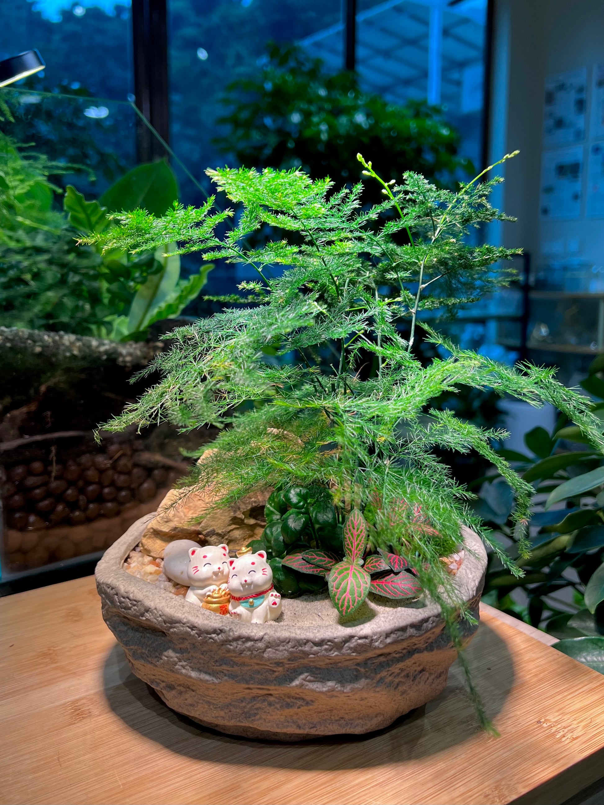 The feathery, cascading texture of the asparagus fern brings softness and movement, while the vibrant, vein-patterned leaves of the fittonia add a pop of color and contrast. Nestled among them, the delicate Bubble Plant adds a touch of whimsy with its rounded, succulent-like foliage.