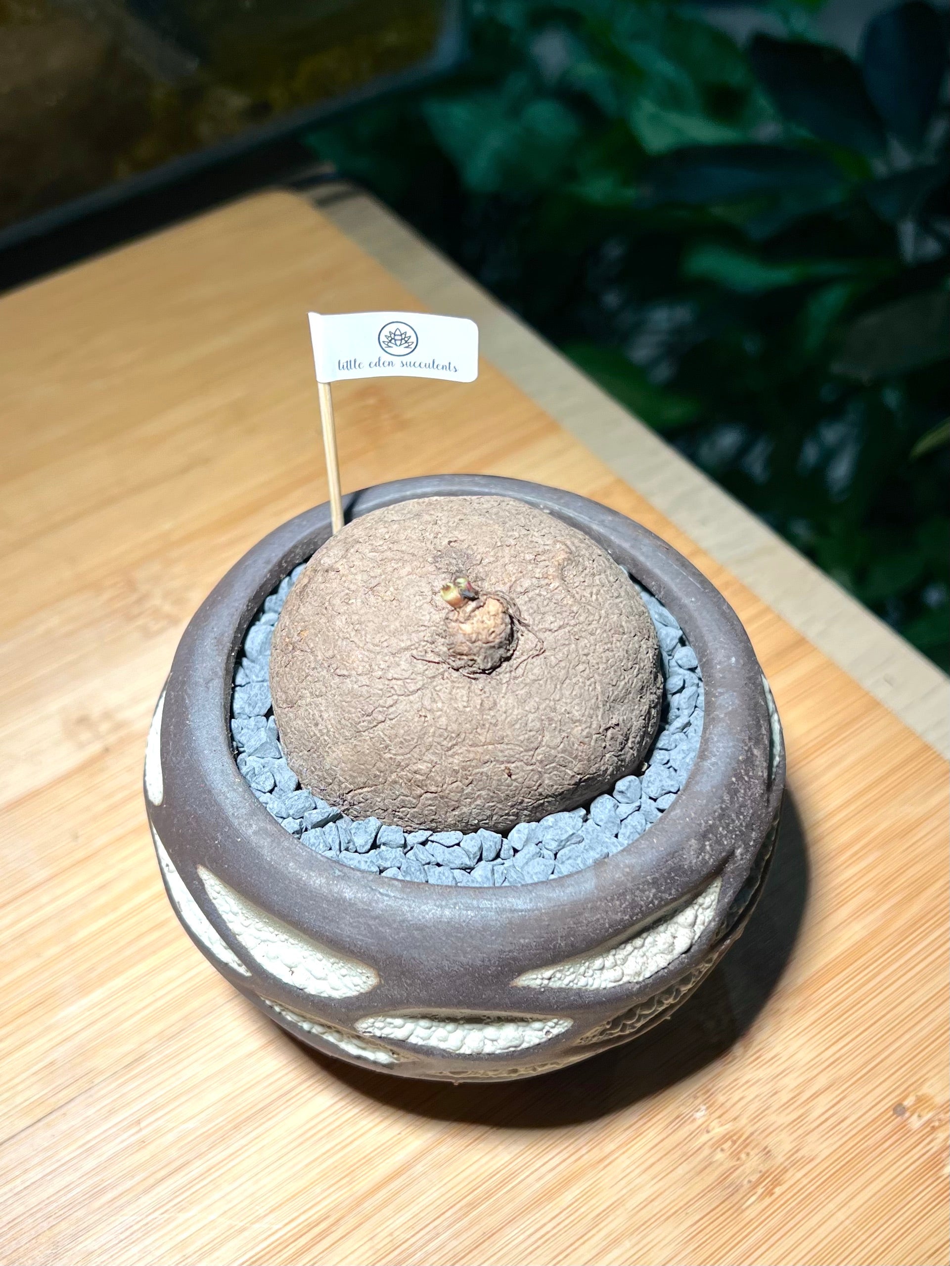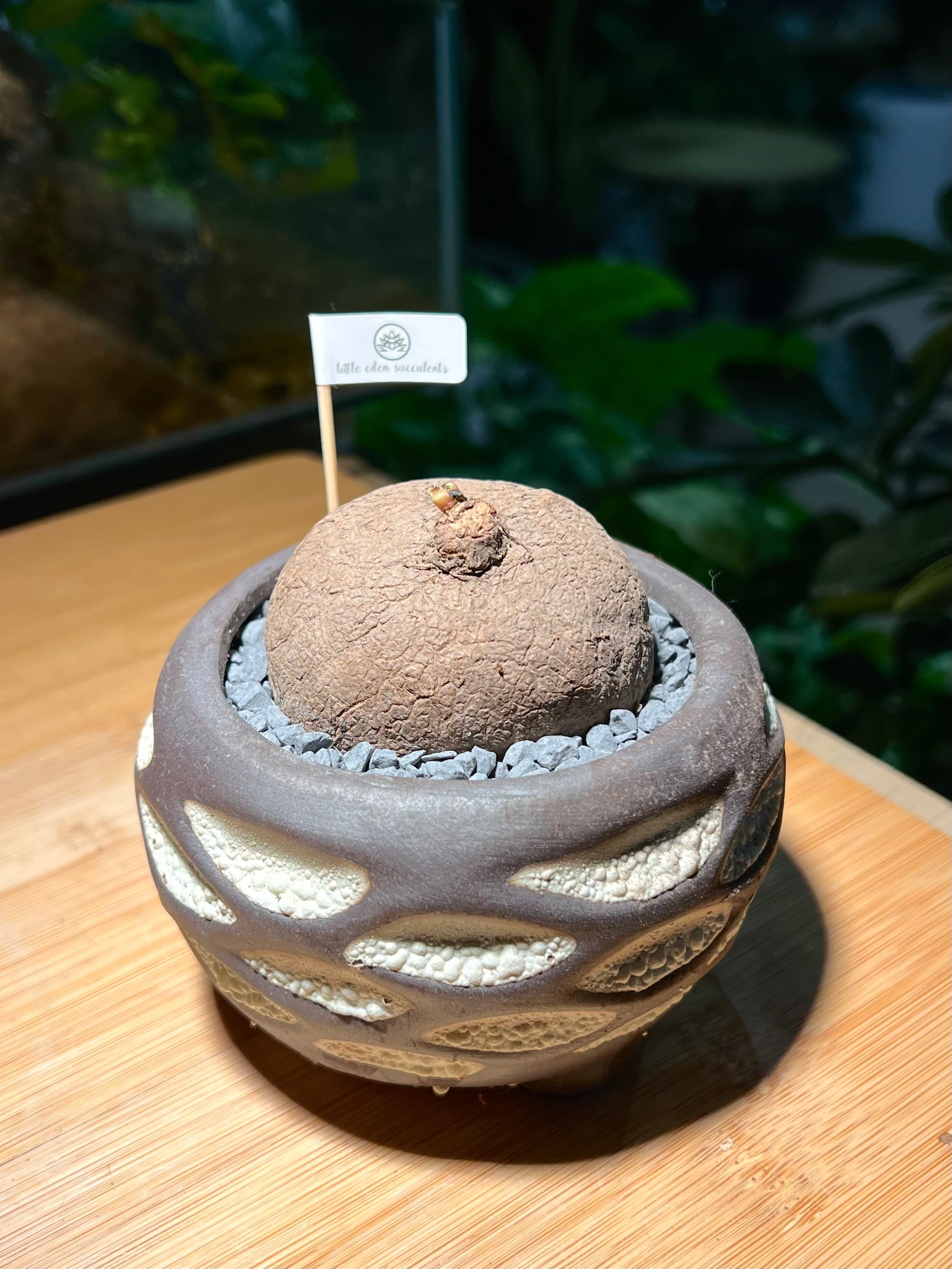 The Stephania’s distinctive caudex and airy, coin-shaped leaves offer a sculptural beauty that pairs effortlessly with the clean, graphic appeal of a black and white round ceramic pot. This modern combination creates a striking contrast—where monochrome design meets the soft, organic flow of living greenery.
