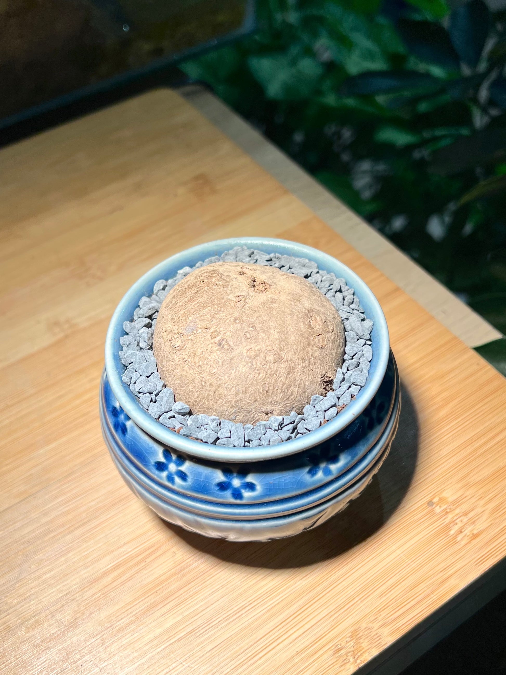 The Stephania’s sculptural caudex and soft, coin-like leaves are beautifully elevated when paired with a blue pattern-designed ceramic pot. The intricate blue patterns—whether floral, geometric, or abstract—add an artistic flair that enhances the plant’s natural elegance without overpowering its quiet charm.
