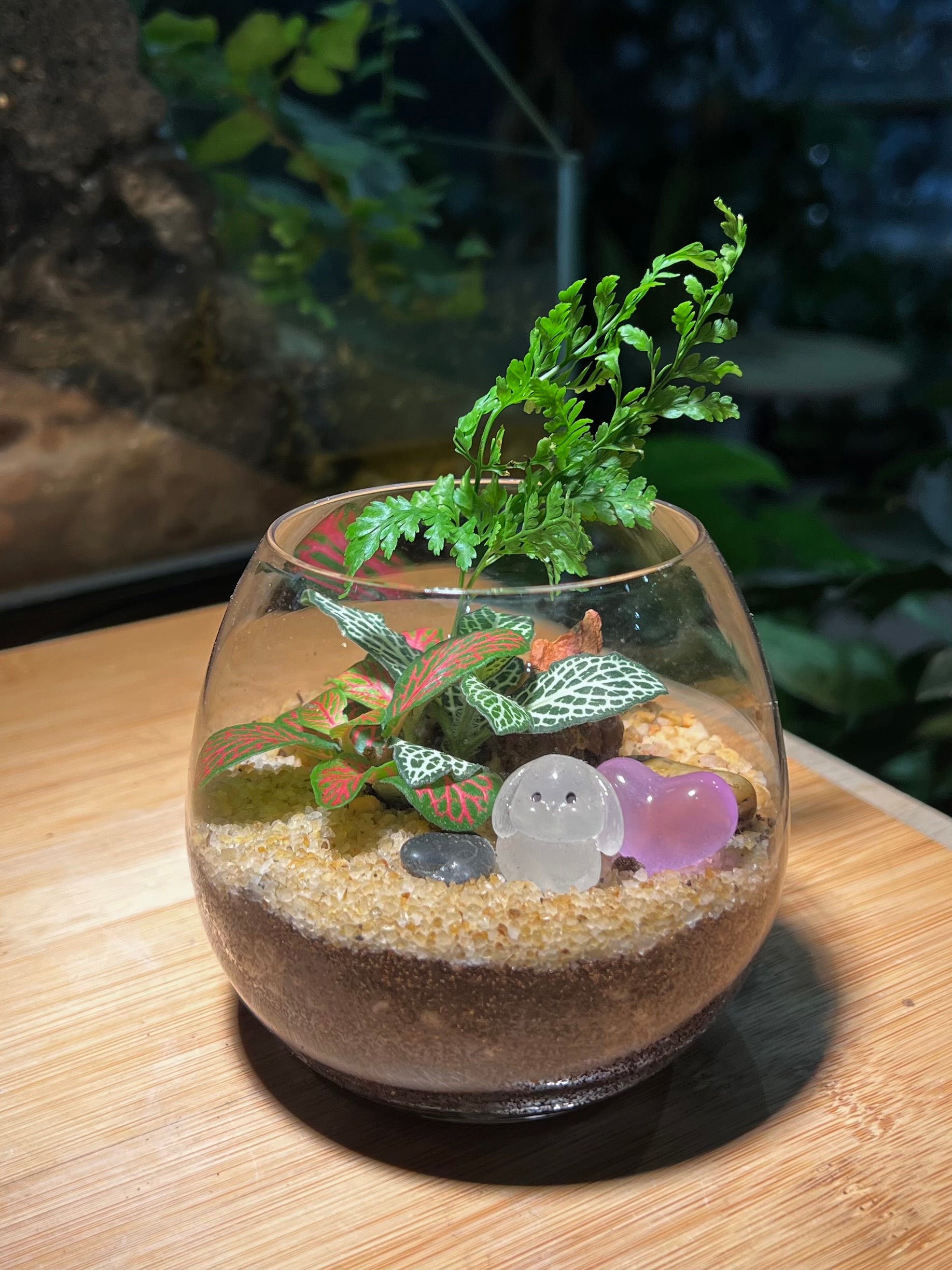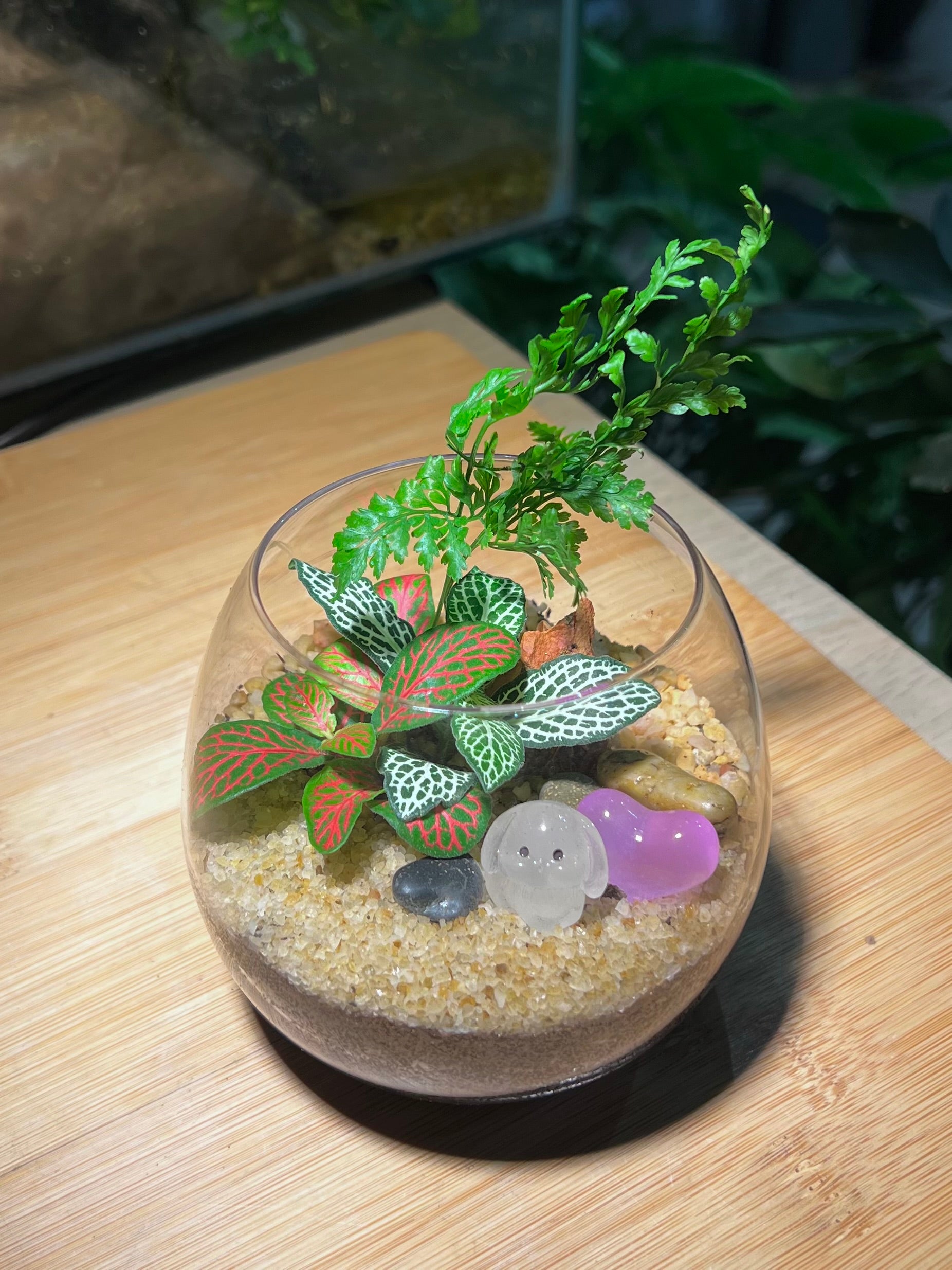 Delicate, vibrant, and delightfully unique, this Fittonia & Fern Arrangement in a Wine Glass brings a touch of botanical charm with a playful twist. Nestled inside the clear curves of an elegant wine glass, the lush green textures of fern fronds blend harmoniously with the striking, veined leaves of the Fittonia (Nerve Plant), creating a miniature garden that’s both stylish and serene.