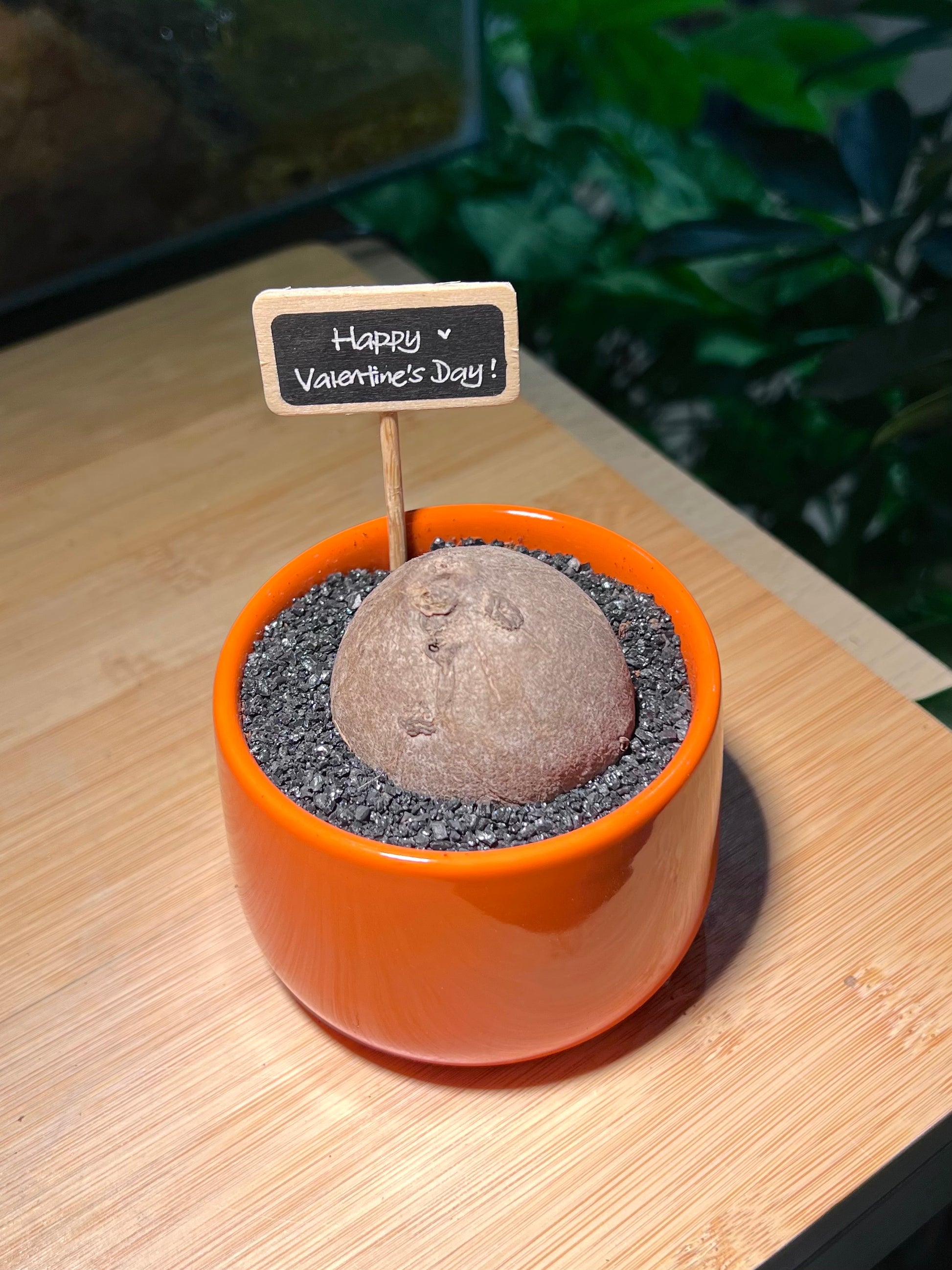 The sculptural elegance of the Stephania—marked by its rounded caudex and delicate, climbing leaves—comes alive in a bright orange pot. Bold and energetic, the vivid hue brings a lively pop of color that contrasts beautifully with the plant’s soft green foliage and earthy base.