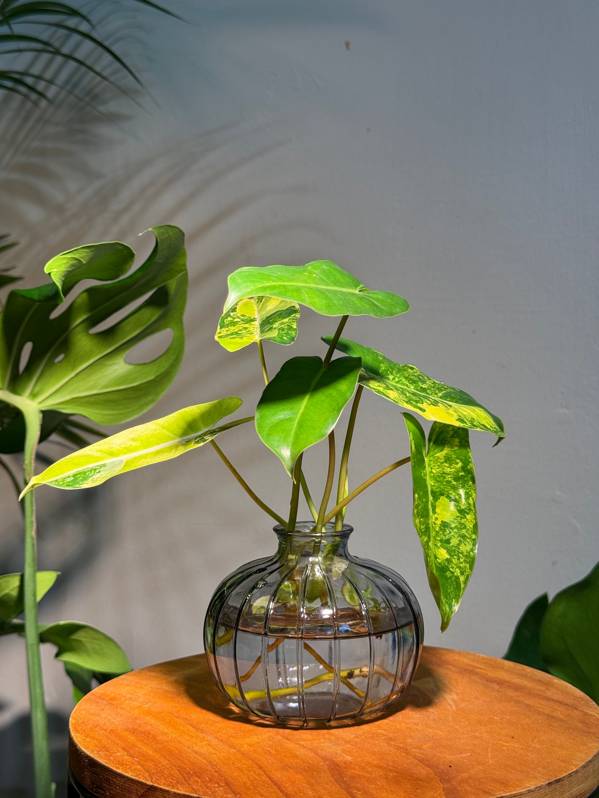 Bring a touch of natural elegance to your space with this stunning Variegated Philodendron, beautifully displayed in a smoky glass vase. The vibrant green and golden variegated leaves add a refreshing aesthetic, while the transparent vase showcases the delicate root system, making it a perfect fusion of botanical beauty and minimalist design.